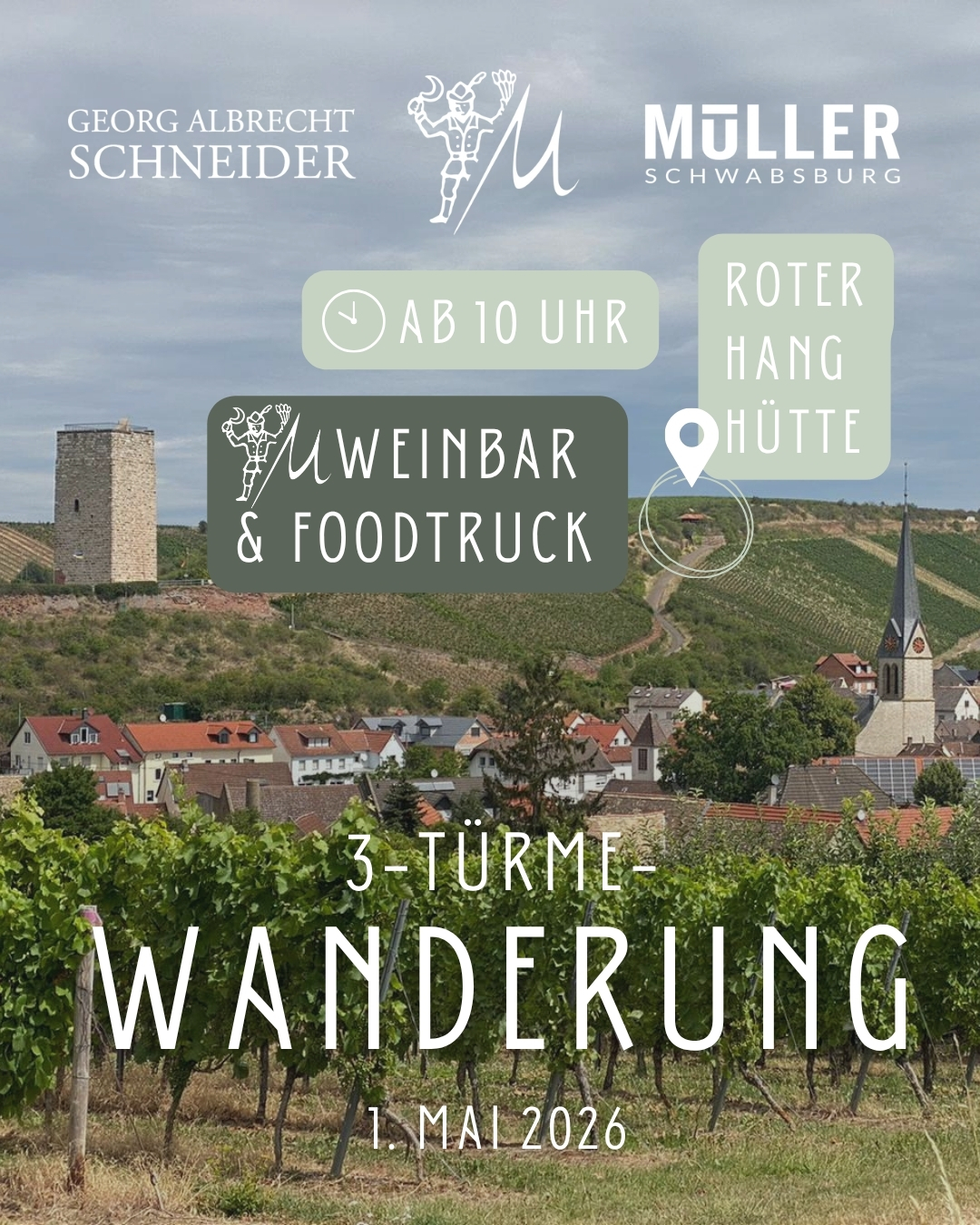 Was: Am 1. Mai heißt es wieder: Raus in die Weinberge! Bei der 3-Türme-Wanderung rund um Nierstein und Schwabsburg erwarten euch traumhafte Ausblicke, gute Stimmung und beste Versorgung entlang des Weges. Wir sind natürlich wie immer mit dabei – ihr findet uns an der Roten Hang Hütte. Macht eine Pause, genießt den weiten Blick über Nierstein und erfrischt euch mit einem Glas kühlem Wein oder spritziger Schorle. Unsere Weine liegen bereit, und ein Foodtruck sorgt für die passende Stärkung. Kommt vorbei, tankt Sonne, Wein und gute Laune – wir freuen uns auf euch! Weinwanderung durch Niersteins Weinberge über den Roten Hang. Dabei die Aussicht und tolle Weine genießen. Ihr findet uns mit unserem Weinstand an der Roter Hang Hütte. Neben unseren Weinen und Weinschorle gibt’s dort auch allerlei Leckereien vom Blue Food Truck.